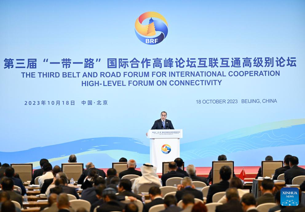 Prime Minister of Egypt Mostafa Madbouly addresses the High-Level Forum on Connectivity of the third Belt and Road Forum for International Cooperation in Beijing, capital of China, Oct. 18, 2023. (Xinhua/Yin Bogu)