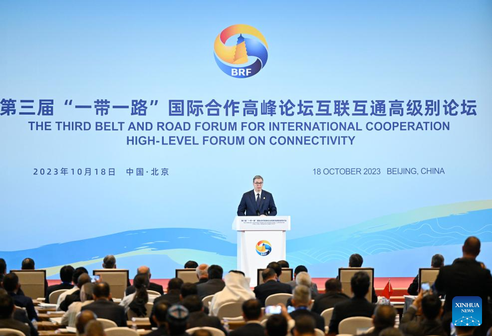 Serbian President Aleksandar Vucic addresses the High-Level Forum on Connectivity of the third Belt and Road Forum for International Cooperation in Beijing, capital of China, Oct. 18, 2023. (Xinhua/Yin Bogu)