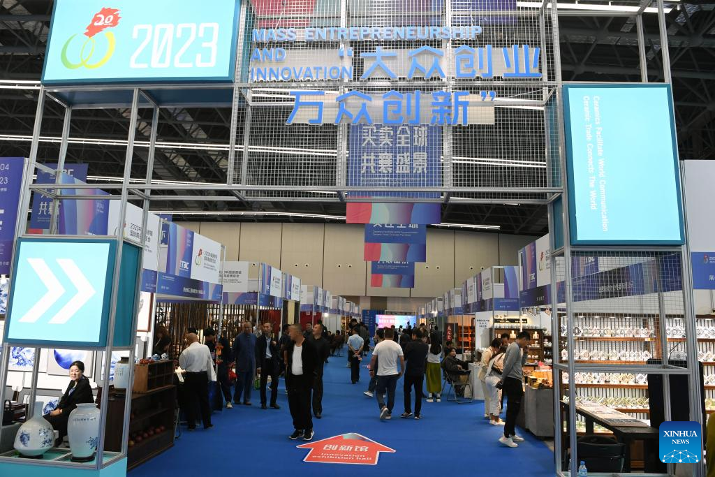 This photo taken on Oct. 18, 2023 shows the mass entrepreneurship and innovation exhibition area of the 2023 China Jingdezhen International Ceramic Expo in Jingdezhen City, east China's Jiangxi Province. (Xinhua/Ma Ning)