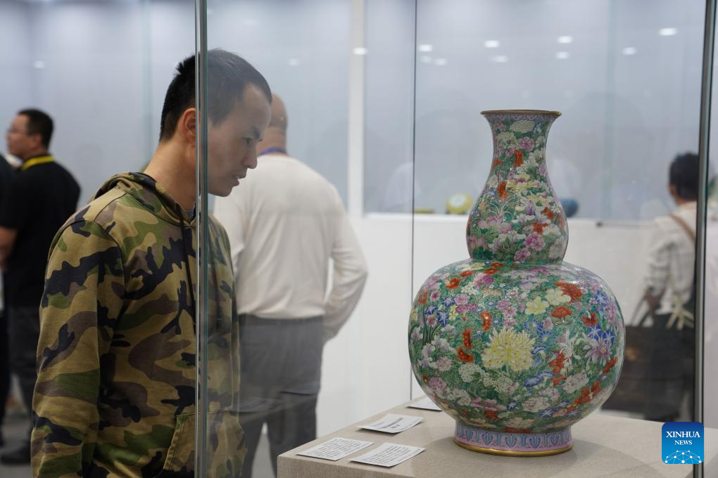 A visitor views an exhibit at an exhibition held during the 2023 China Jingdezhen International Ceramic Expo in Jingdezhen City, east China's Jiangxi Province, Oct. 18, 2023. (Xinhua/Zhou Mi)