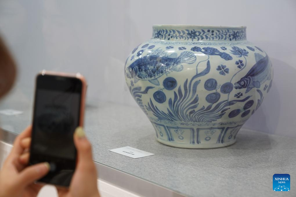A visitor takes photos of an exhibit at an exhibition held during the 2023 China Jingdezhen International Ceramic Expo in Jingdezhen City, east China's Jiangxi Province, Oct. 18, 2023. (Xinhua/Zhou Mi)