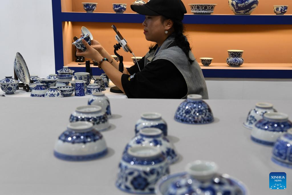 An exhibitor promotes ceramic products via livestreaming at the 2023 China Jingdezhen International Ceramic Expo in Jingdezhen City, east China's Jiangxi Province, Oct. 18, 2023. (Xinhua/Ma Ning)
