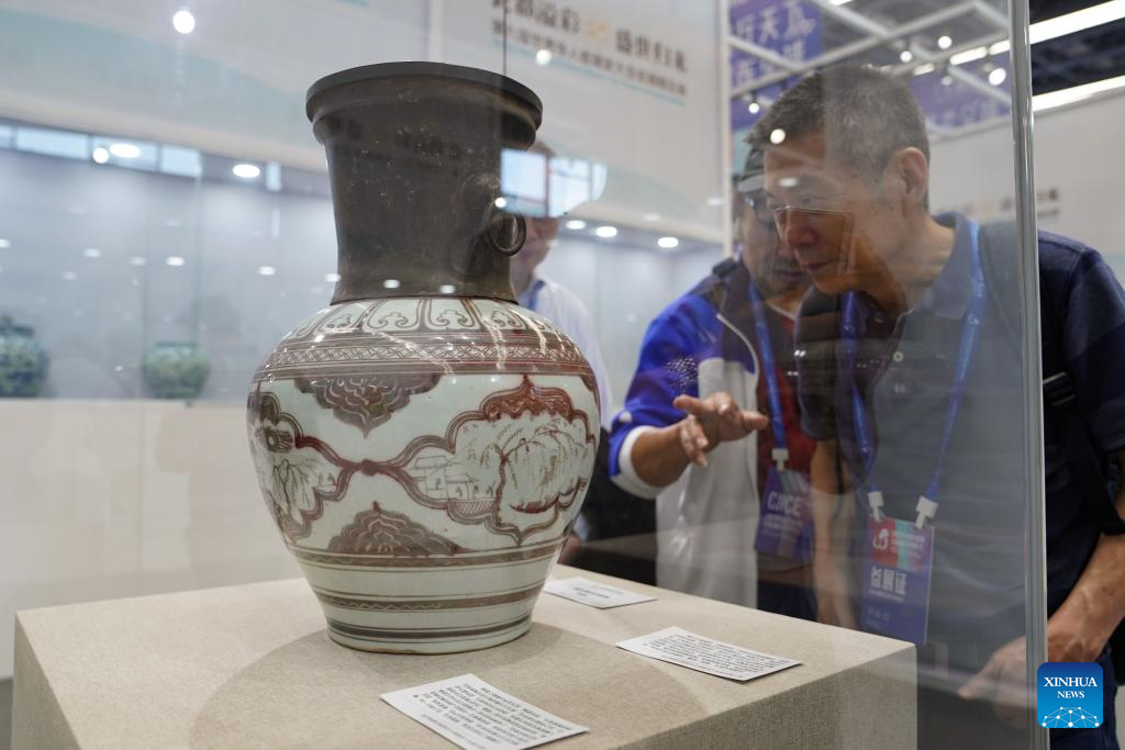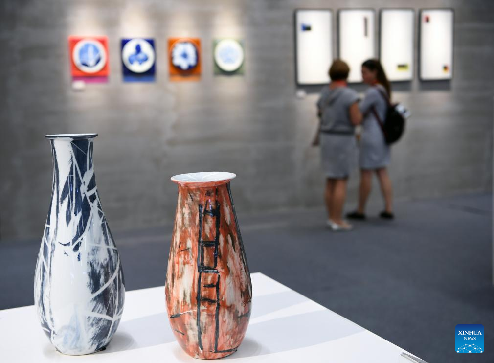 Visitors view an exhibit at an exhibition held during the 2023 China Jingdezhen International Ceramic Expo in Jingdezhen City, east China's Jiangxi Province, Oct. 18, 2023. (Xinhua/Zhou Mi)