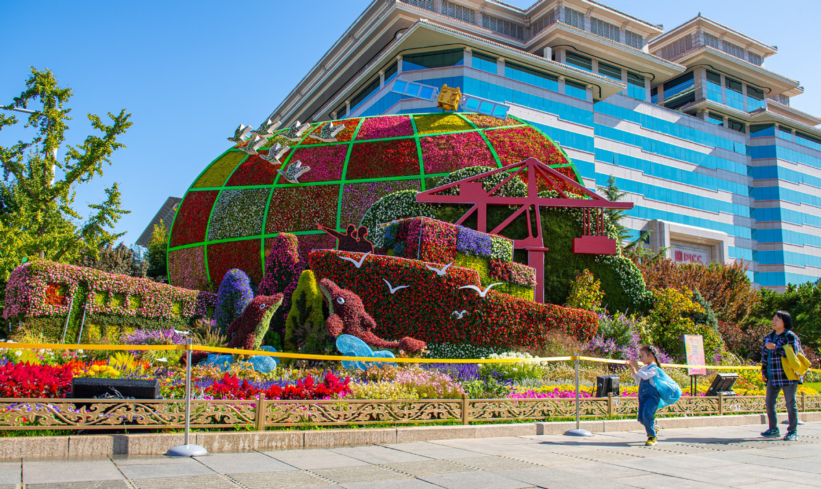 This photo taken on Oct 15, 2023 shows a floral decoration at Xidan area in Beijing, capital of China. [Photo/Xinhua]