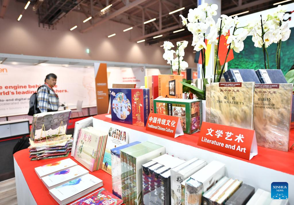 A man visits the exhibition area of China at the 75th Frankfurt Book Fair in Frankfurt, Germany, Oct. 18, 2023. The 75th Frankfurt Book Fair opened its doors to visitors on Wednesday, with an opening ceremony held on Tuesday. The five-day event running through Oct. 22 will provide diverse programs catering to both trade professionals and the public. (Xinhua/Ren Pengfei)