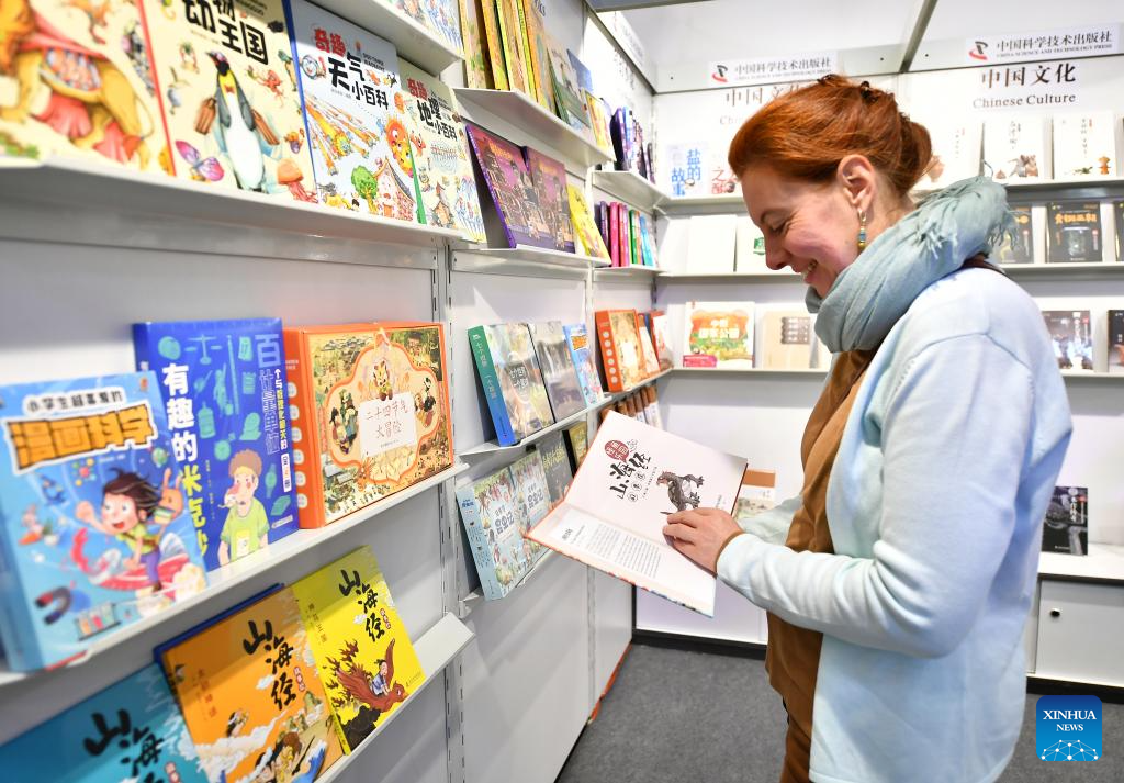 A woman visits the exhibition area of China at the 75th Frankfurt Book Fair in Frankfurt, Germany, Oct. 18, 2023. The 75th Frankfurt Book Fair opened its doors to visitors on Wednesday, with an opening ceremony held on Tuesday. The five-day event running through Oct. 22 will provide diverse programs catering to both trade professionals and the public. (Xinhua/Ren Pengfei)