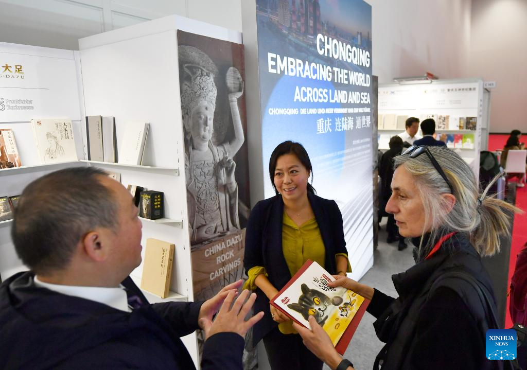 People talk at the exhibition area of China at the 75th Frankfurt Book Fair in Frankfurt, Germany, Oct. 18, 2023. The 75th Frankfurt Book Fair opened its doors to visitors on Wednesday, with an opening ceremony held on Tuesday. The five-day event running through Oct. 22 will provide diverse programs catering to both trade professionals and the public. (Xinhua/Ren Pengfei)