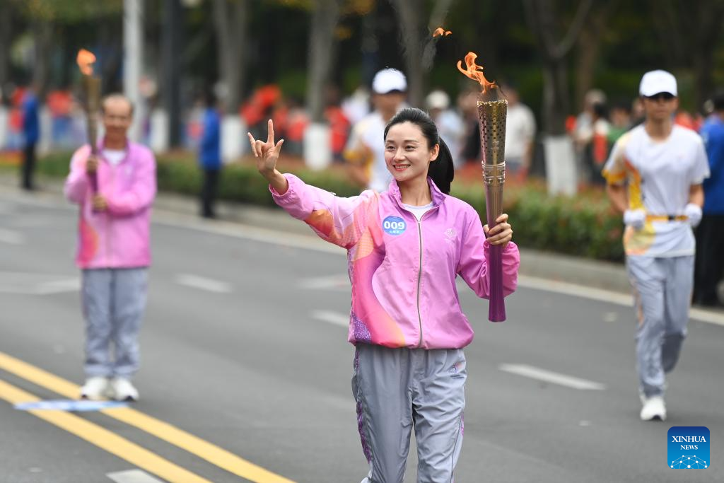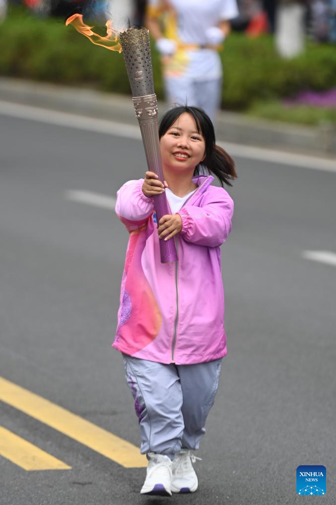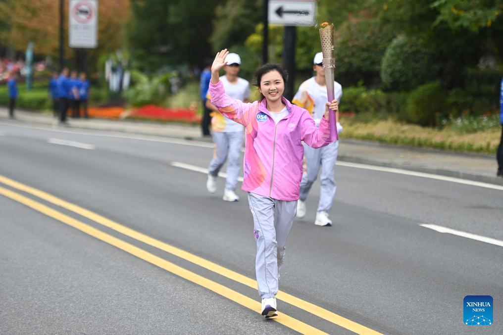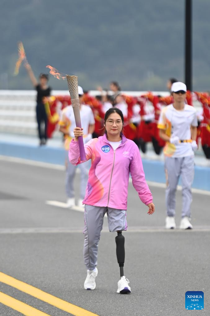 Torch bearer Tan Yujiao takes part in the torch relay of the 4th Asian Para Games in Chun'an County, Hangzhou, capital of east China's Zhejiang Province, Oct. 19, 2023. (Xinhua/Huang Zongzhi)
