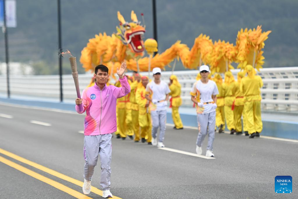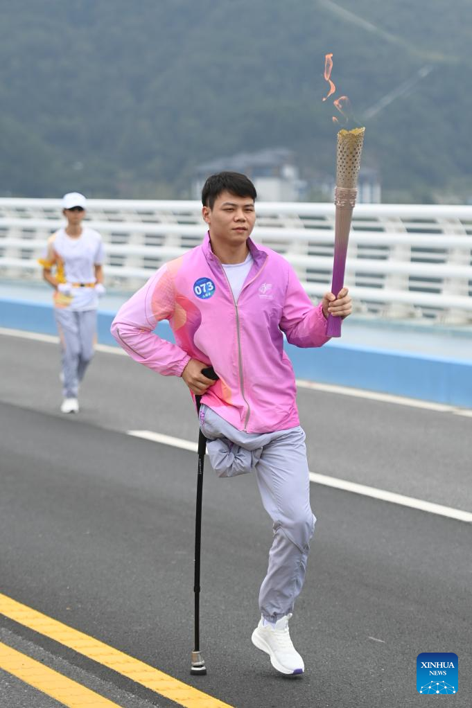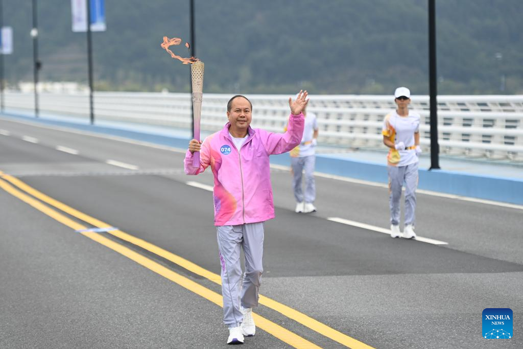 Torch bearer Zheng Longhua takes part in the torch relay of the 4th Asian Para Games in Chun'an County, Hangzhou, capital of east China's Zhejiang Province, Oct. 19, 2023. (Xinhua/Huang Zongzhi)