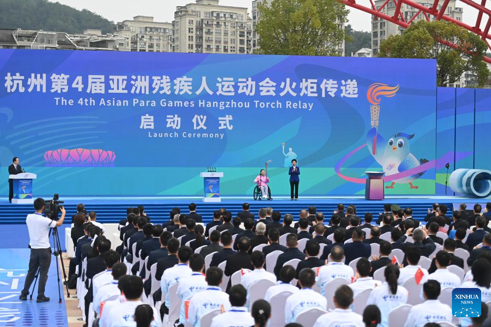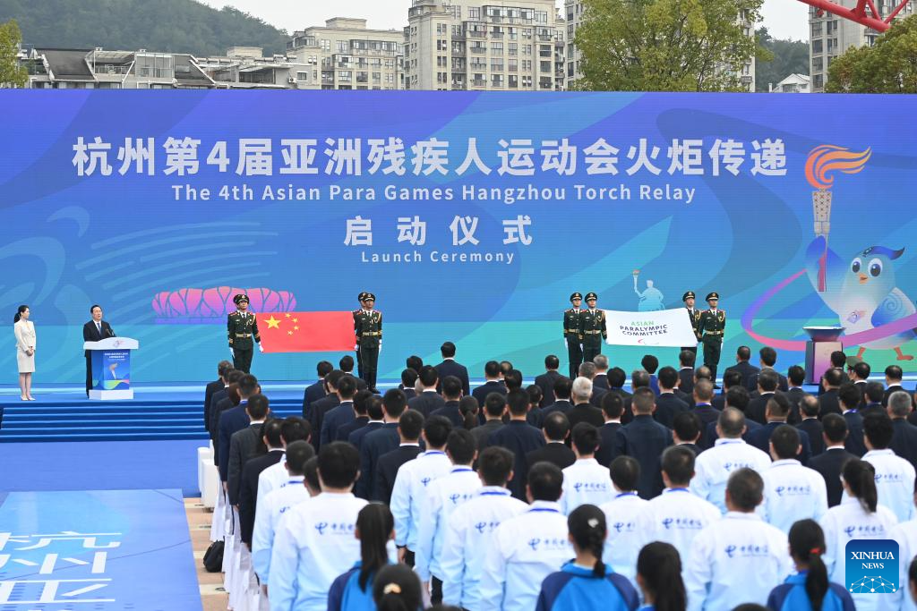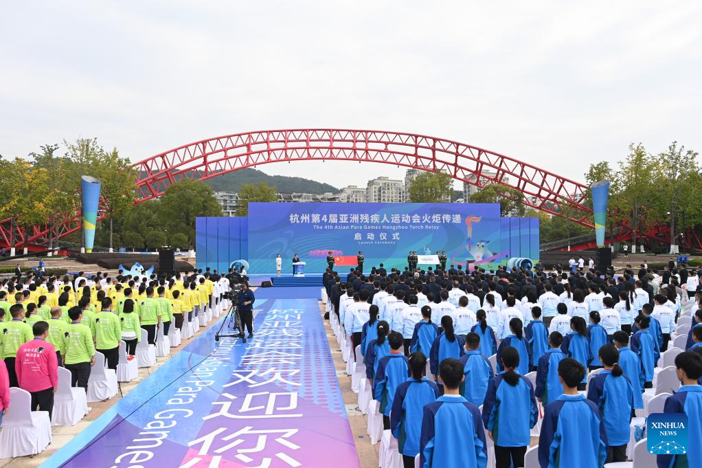 Photo taken on Oct. 19, 2023 shows the launch ceremony of the torch relay of the 4th Asian Para Games in Chun'an County, Hangzhou, capital of east China's Zhejiang Province. (Xinhua/Huang Zongzhi)