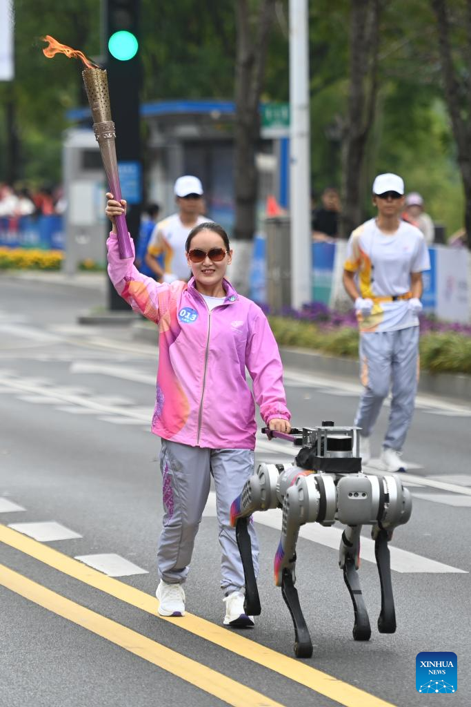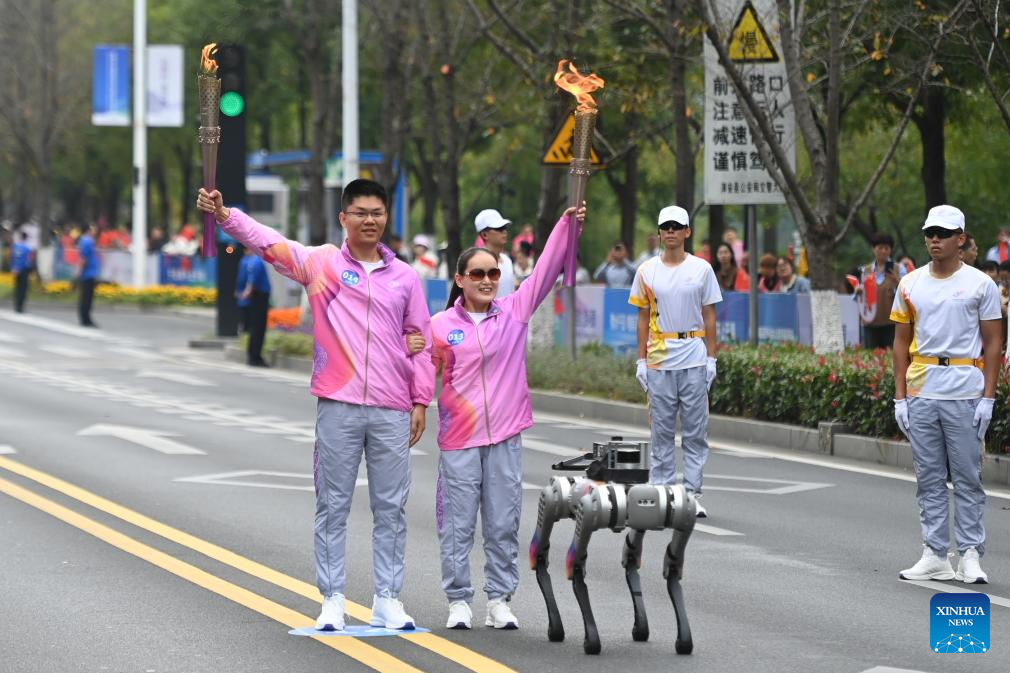Torch bearer Cai Qionghui, accompanied by a robotic guide dog, takes part in the torch relay of the 4th Asian Para Games in Chun'an County, Hangzhou, capital of east China's Zhejiang Province, Oct. 19, 2023. (Xinhua/Huang Zongzhi)