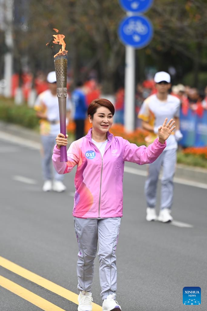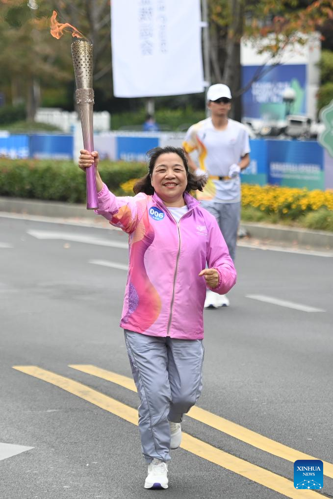 Torch bearer Wang Liqun takes part in the torch relay of the 4th Asian Para Games in Chun'an County, Hangzhou, capital of east China's Zhejiang Province, Oct. 19, 2023. (Xinhua/Huang Zongzhi)