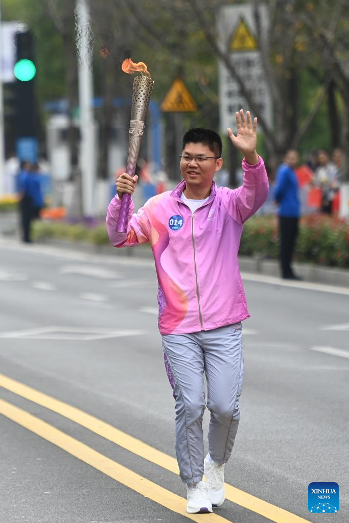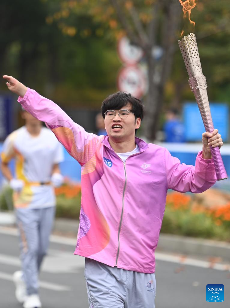 Torch bearer Ye Changwei takes part in the torch relay of the 4th Asian Para Games in Chun'an County, Hangzhou, capital of east China's Zhejiang Province, Oct. 19, 2023. (Xinhua/Huang Zongzhi)