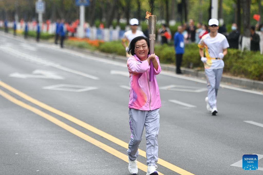 Torch bearer Sun Juping takes part in the torch relay of the 4th Asian Para Games in Chun'an County, Hangzhou, capital of east China's Zhejiang Province, Oct. 19, 2023. (Xinhua/Huang Zongzhi)