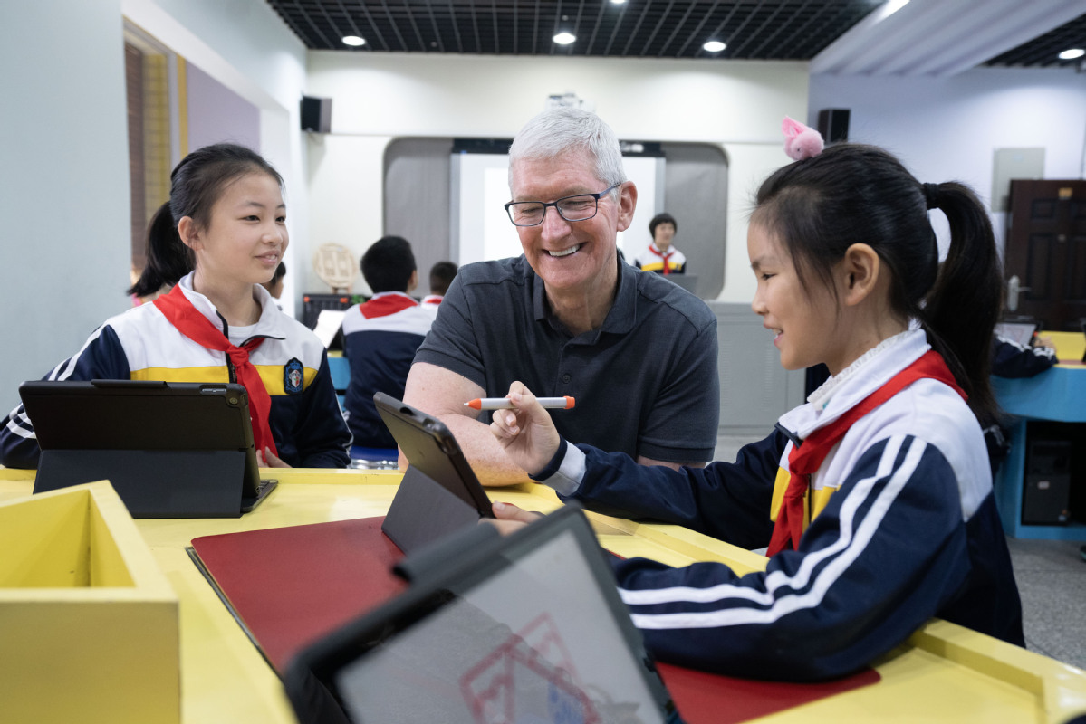Tim Cook, CEO of Apple, talks with students at a school in Ya'an, Sichuan province. CHINA DAILY