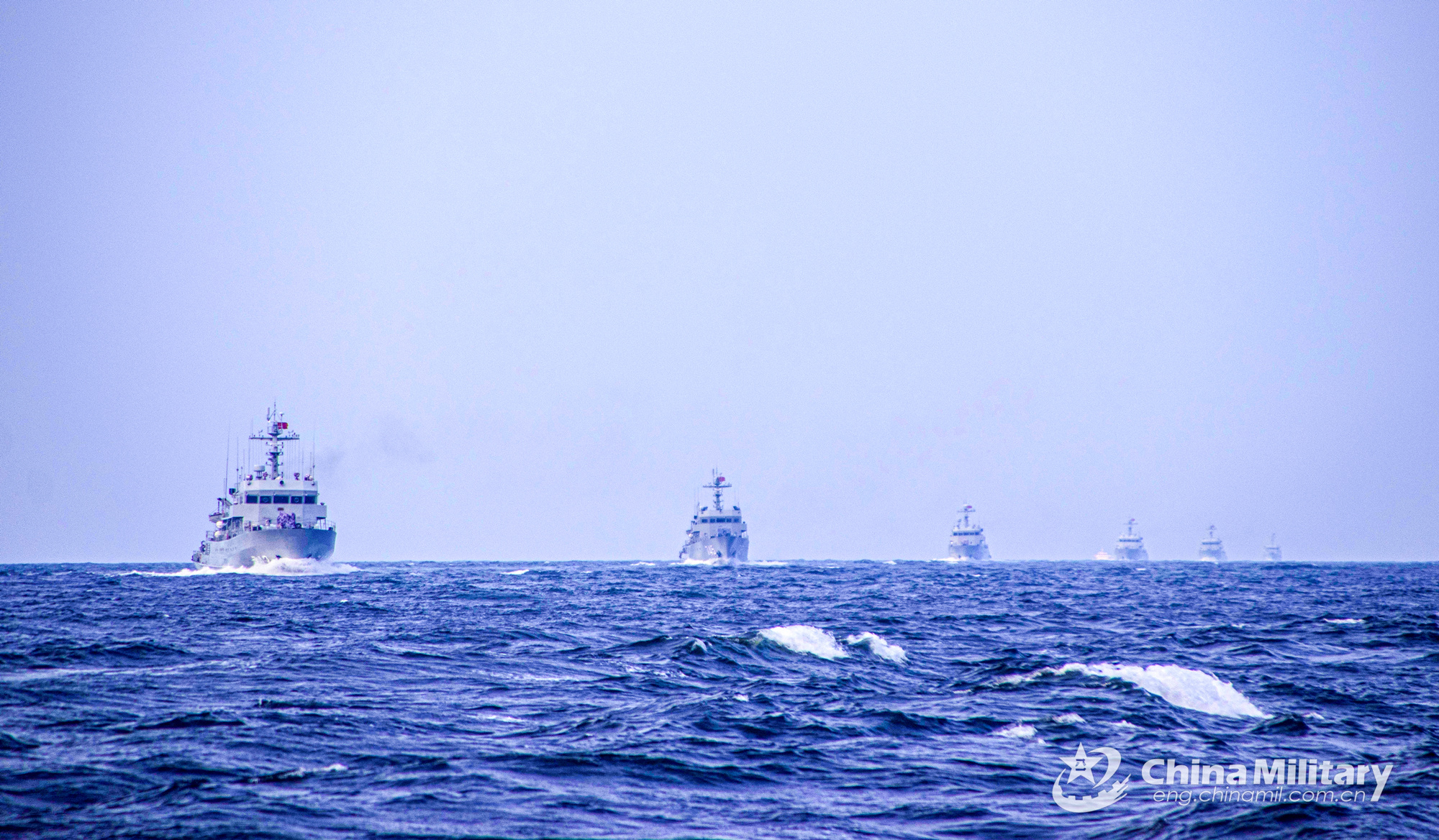 Vessels attached to a naval minesweeper flotilla of the PLA Navy sail information during a round-the-clock mine-countermeasures (MCM) training exercise. The exercise, which was held in unfamiliar seaareas from September 9 to September 13, 2023, aimed to hone the troops' combat capabilities. (eng.chinamil.com.cn/Photo by He Yuqian)