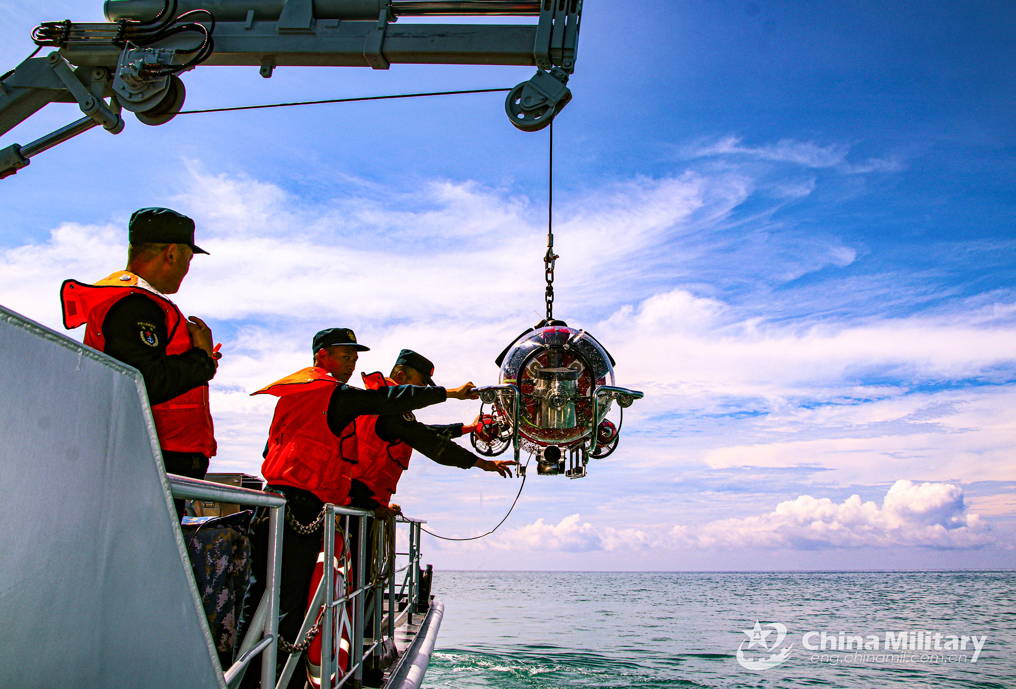 Sailors assigned to a naval minesweeper flotilla of the PLA Navy deploy mineneutralization vehicle during a round-the-clock mine-countermeasures (MCM) training exercise. The exercise, which was held in unfamiliar sea areas from September 9 to September 13, aimed to hone the troops'combat capabilities. (eng.chinamil.com.cn/Photo by Du Jialei)