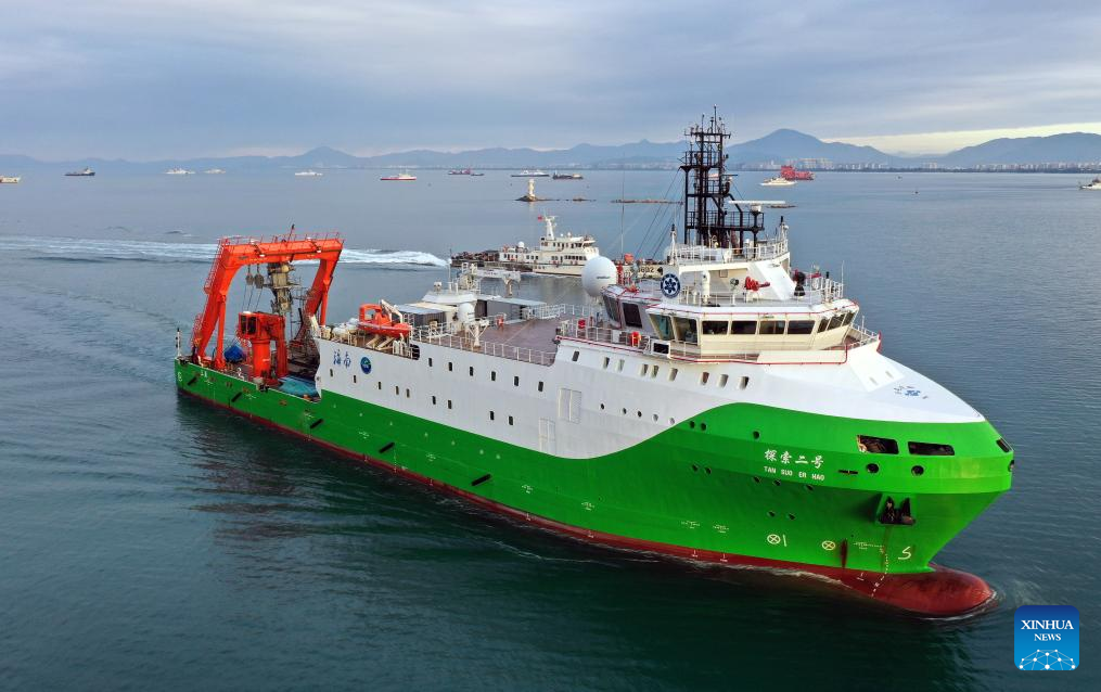 This aerial photo taken on Oct. 10, 2023 shows the scientific research ship Tansuo-2 carrying submersible Shenhai Yongshi (Deep Sea Warrior) returning to Sanya of south China's Hainan Province after conducting deep-sea archaeological investigation in the South China Sea. (Xinhua/Guo Cheng)