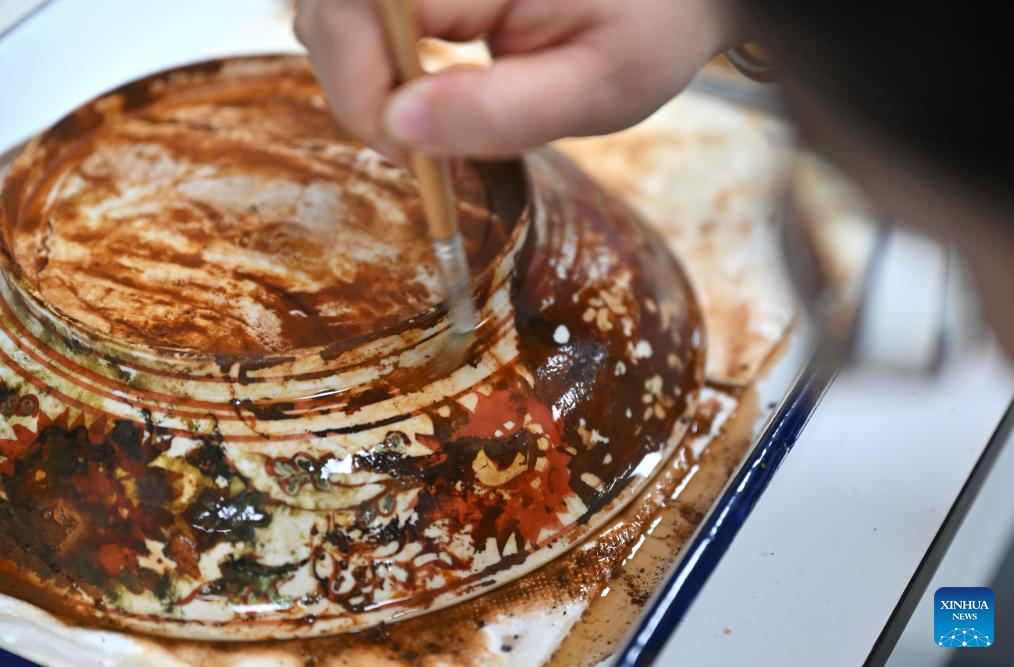 An archaeologist clears up a piece of cultural relic unearthed from ancient shipwrecks discovered in the South China Sea, Oct. 10, 2023. (Xinhua/Guo Cheng)