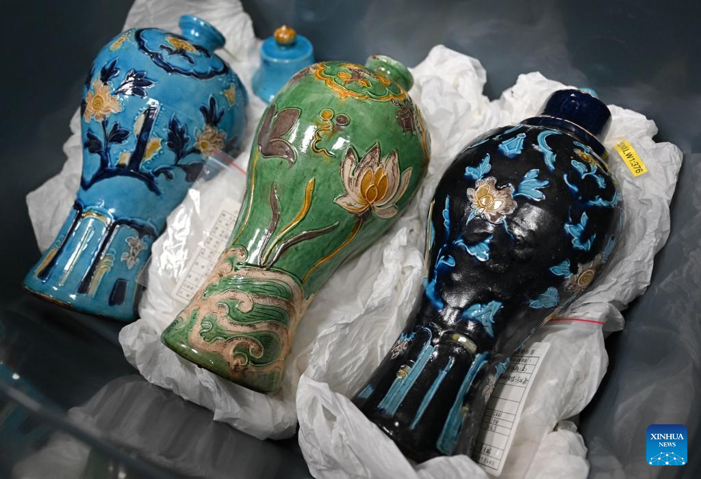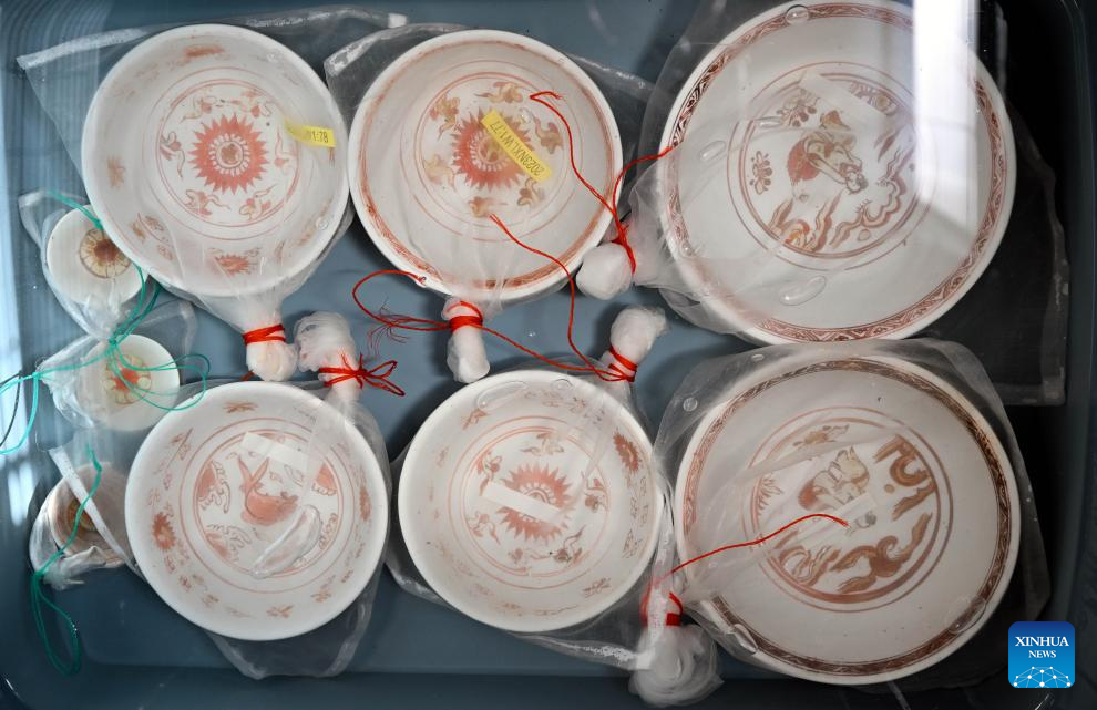 This photo taken on Oct. 10, 2023 shows cultural relics unearthed from ancient shipwrecks discovered in the South China Sea. (Xinhua/Guo Cheng)