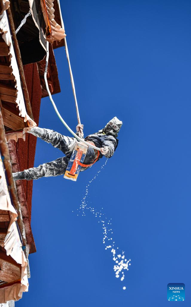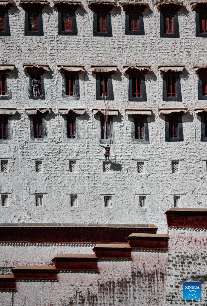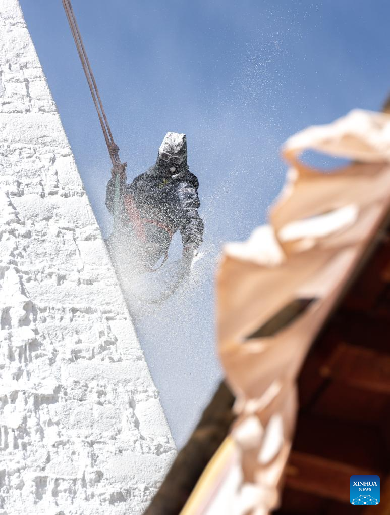 A worker paints the wall of the Potala Palace during an annual renovation of the ancient architectural complex in Lhasa, southwest China's Tibet Autonomous Region, Oct. 18, 2023. (Xinhua/Jigme Dorje)
