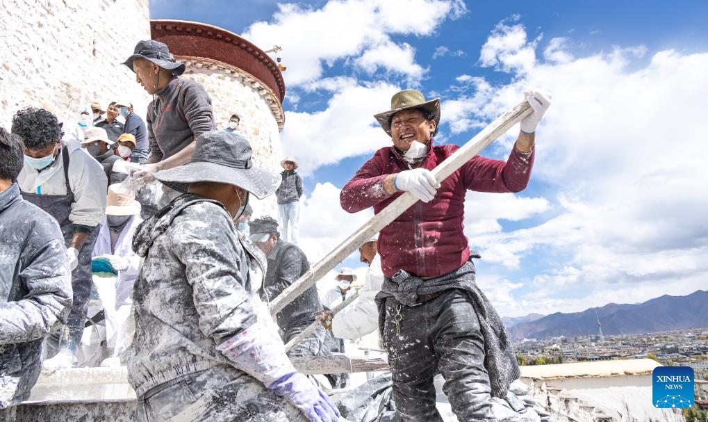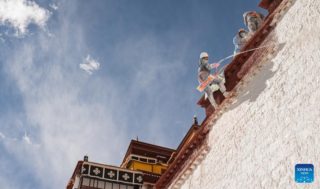 Workers paint the wall of the Potala Palace during an annual renovation of the ancient architectural complex in Lhasa, southwest China's Tibet Autonomous Region, Oct. 19, 2023. (Photo by Tenzin Nyida/Xinhua)