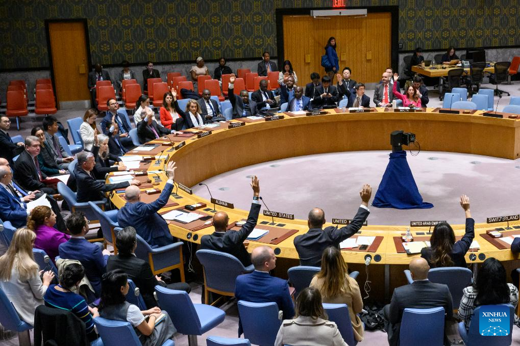 Representatives vote on a draft resolution during a UN Security Council meeting at the UN headquarters in New York, on Oct. 19, 2023. The UN Security Council on Thursday adopted a resolution to extend the ban on the illicit export of petroleum, including crude oil and refined petroleum products, from Libya. (Loey Felipe/UN Photo/Handout via Xinhua)