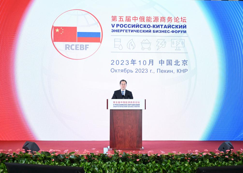 Chinese Vice Premier Ding Xuexiang, also a member of the Standing Committee of the Political Bureau of the Communist Party of China Central Committee, addresses the opening ceremony of the fifth China-Russia Energy Business Forum and reads a congratulatory letter from Chinese President Xi Jinping, in Beijing, capital of China, Oct. 19, 2023. The fifth China-Russia Energy Business Forum opened on Thursday in Beijing. (Xinhua/Yan Yan)