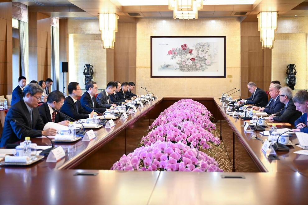 Chinese Vice Premier Ding Xuexiang, also a member of the Standing Committee of the Political Bureau of the Communist Party of China Central Committee, meets with the Russian high-level delegation attending the fifth China-Russia Energy Business Forum in Beijing, capital of China, Oct. 19, 2023. The fifth China-Russia Energy Business Forum opened on Thursday in Beijing, with Ding addressing the opening ceremony and reading a congratulatory letter from Chinese President Xi Jinping. (Xinhua/Yan Yan)
