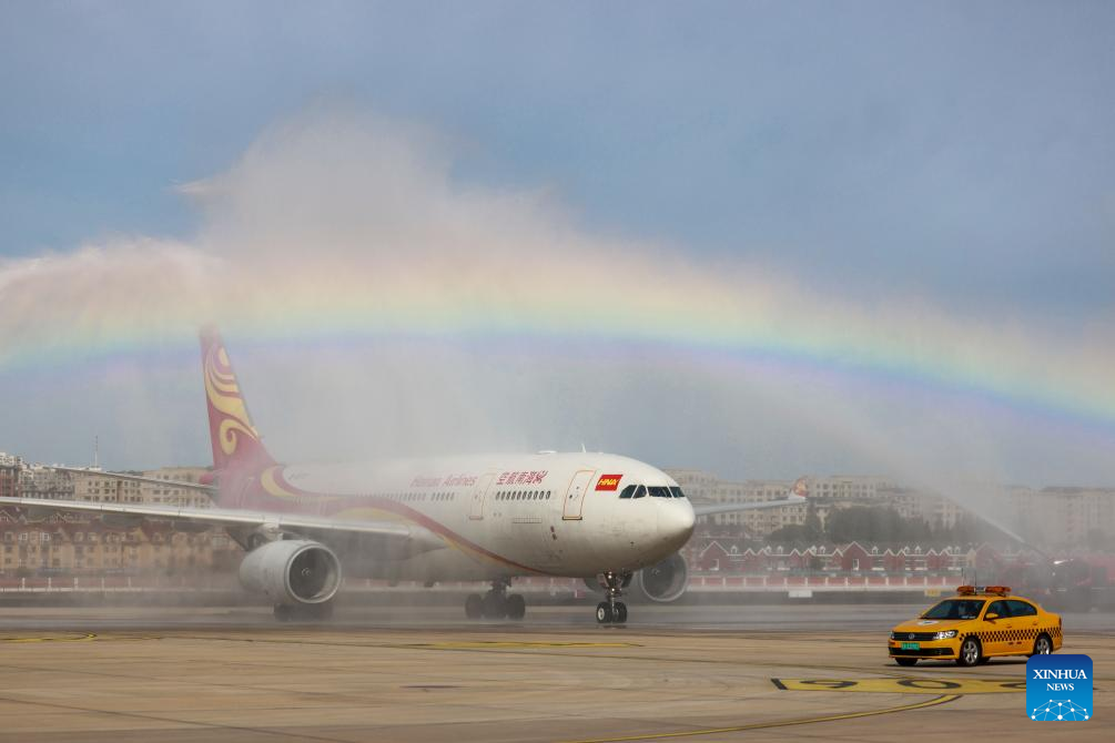 A Hainan Airlines flight is welcomed by a water cannon salute at the Dalian International Airport in Dalian, northeast China's Liaoning Province on Oct. 19, 2023, after a direct flight from Russia's Vladivostok to Dalian. (Xinhua)