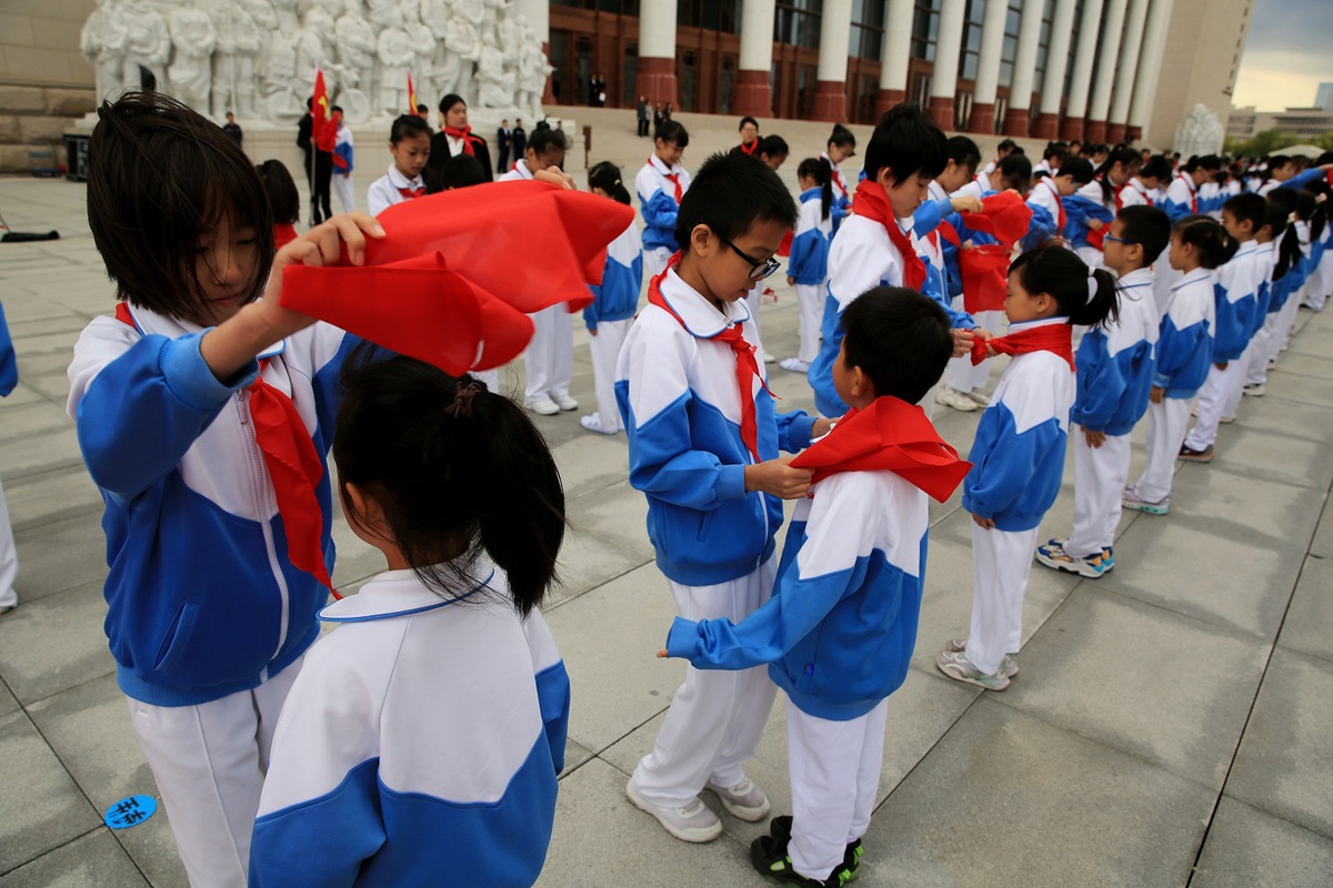 Senior students help put on red scarves for the new Young Pioneers at a ceremony held at the Museum of the Communist Party of China, Oct 13, 2023. More than 1,400 students from Beijing Primary School took part in a ceremony for new Young Pioneers, also part of the celebration on the 74th anniversary of the founding of the Chinese Young Pioneers. [Photo by Du Lianyi/chinadaily.com.cn]