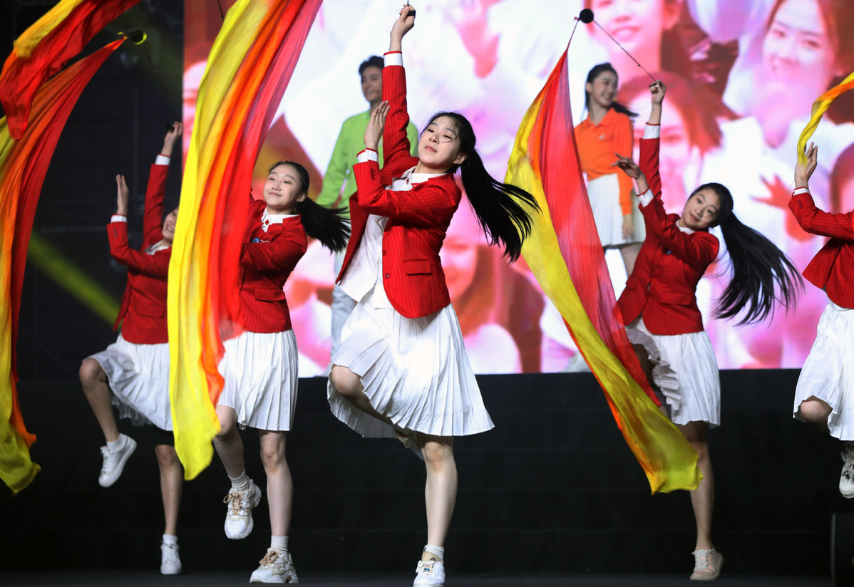 Volunteers perform on stage at the swearing-in ceremony for volunteers of the upcoming sixth China International Import Expo (CIIE) in Shanghai, Oct 17, 2023. A swearing-in ceremony for volunteers of the sixth CIIE was held at the National Exhibition and Convention Center (Shanghai) on Tuesday. Up until now, the sixth CIIE has recruited over 5,700 volunteers from 40 universities in Shanghai. The duties of the volunteers include guiding people around the venue and handling other related work during the event. [Photo/Xinhua]