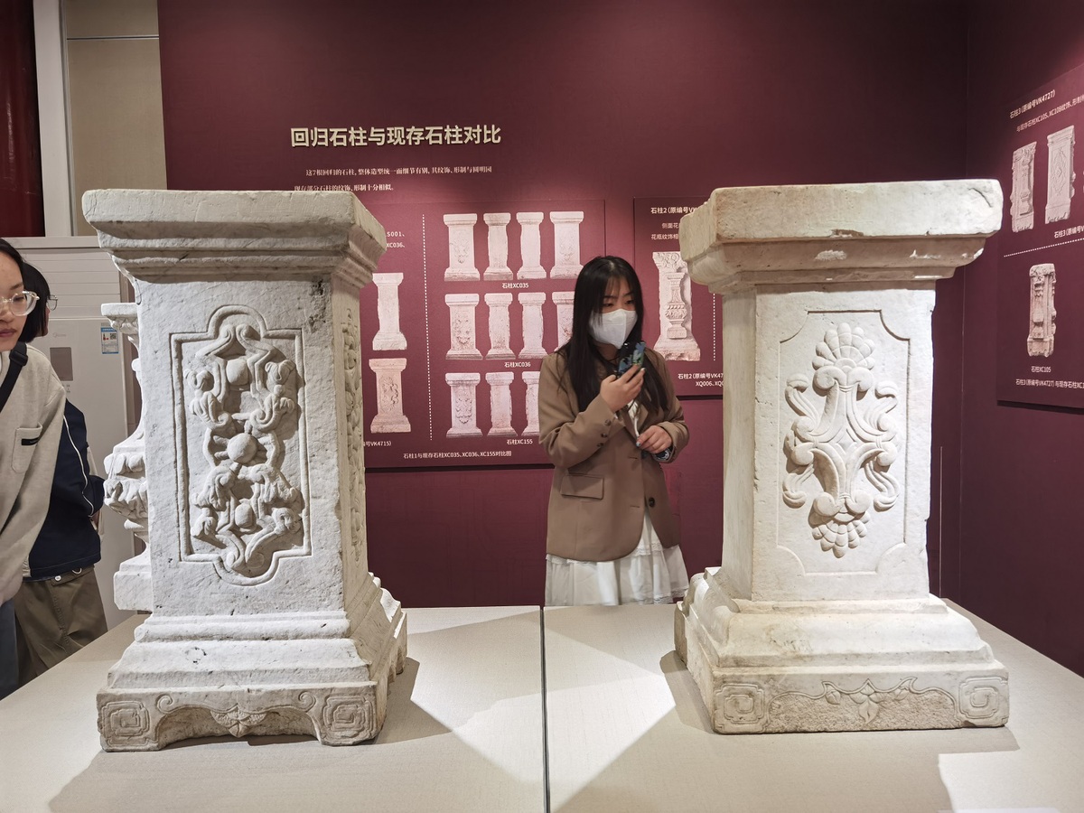 Two repatriated marble columns on display in Zhengjue Temple in Yuanmingyuan, Oct 13, 2023. After a long odyssey overseas, seven marble columns from the ruins of Yuanmingyuan, or the Old Summer Palace, in Beijing which were recently repatriated from Norway to their home site were publicly exhibited for the first time on Friday. [Photo by Wang Kaihao/China Daily]