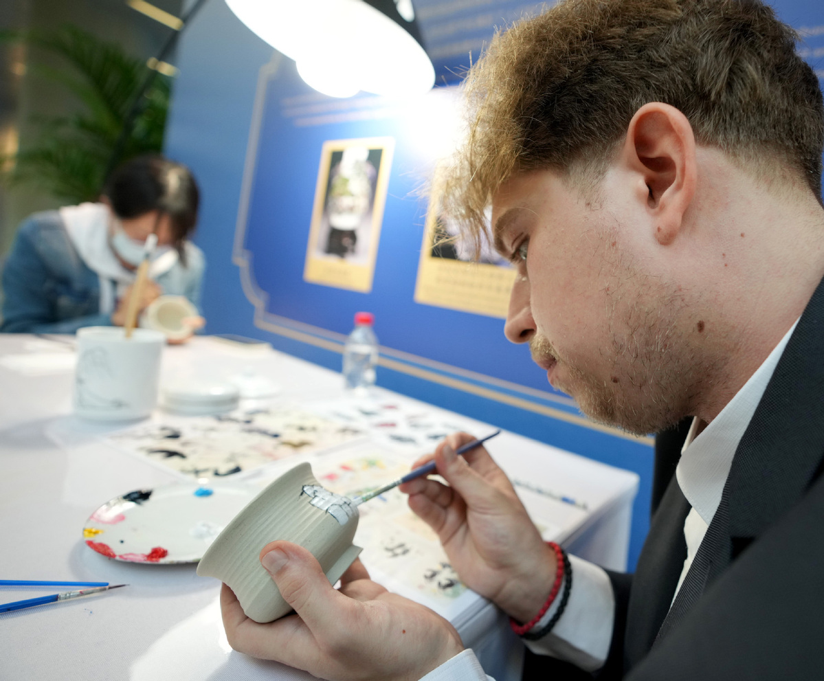 A Hungarian reporter experiences the making of porcelain at the Intangible Cultural Heritage Interactive Exhibition Area at the Media Center of the third Belt and Road Forum for International Cooperation in Beijing, capital of China, Oct 16, 2023. The third Belt and Road Forum for International Cooperation will be held in Beijing from Oct 17 to 18. [Photo/Xinhua]