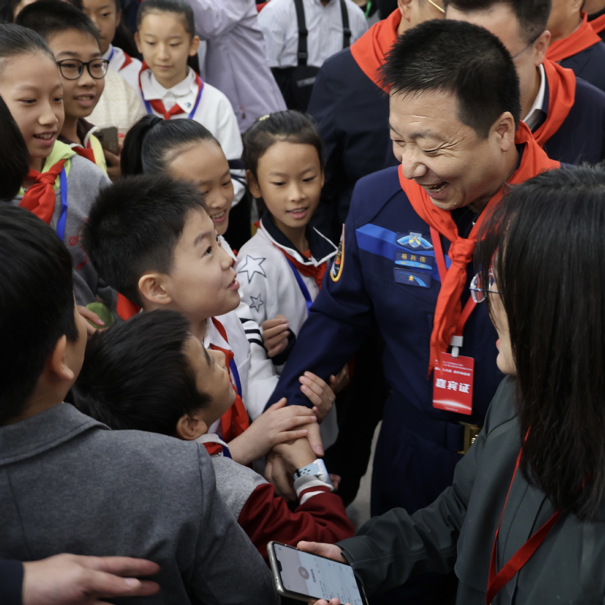 Yang Liwei interacts with young students during an activity in Beijing on Oct 16, 2023 to commemorate the 20th anniversary of China's first manned space flight. XU JINGXING/CHINA DAILY