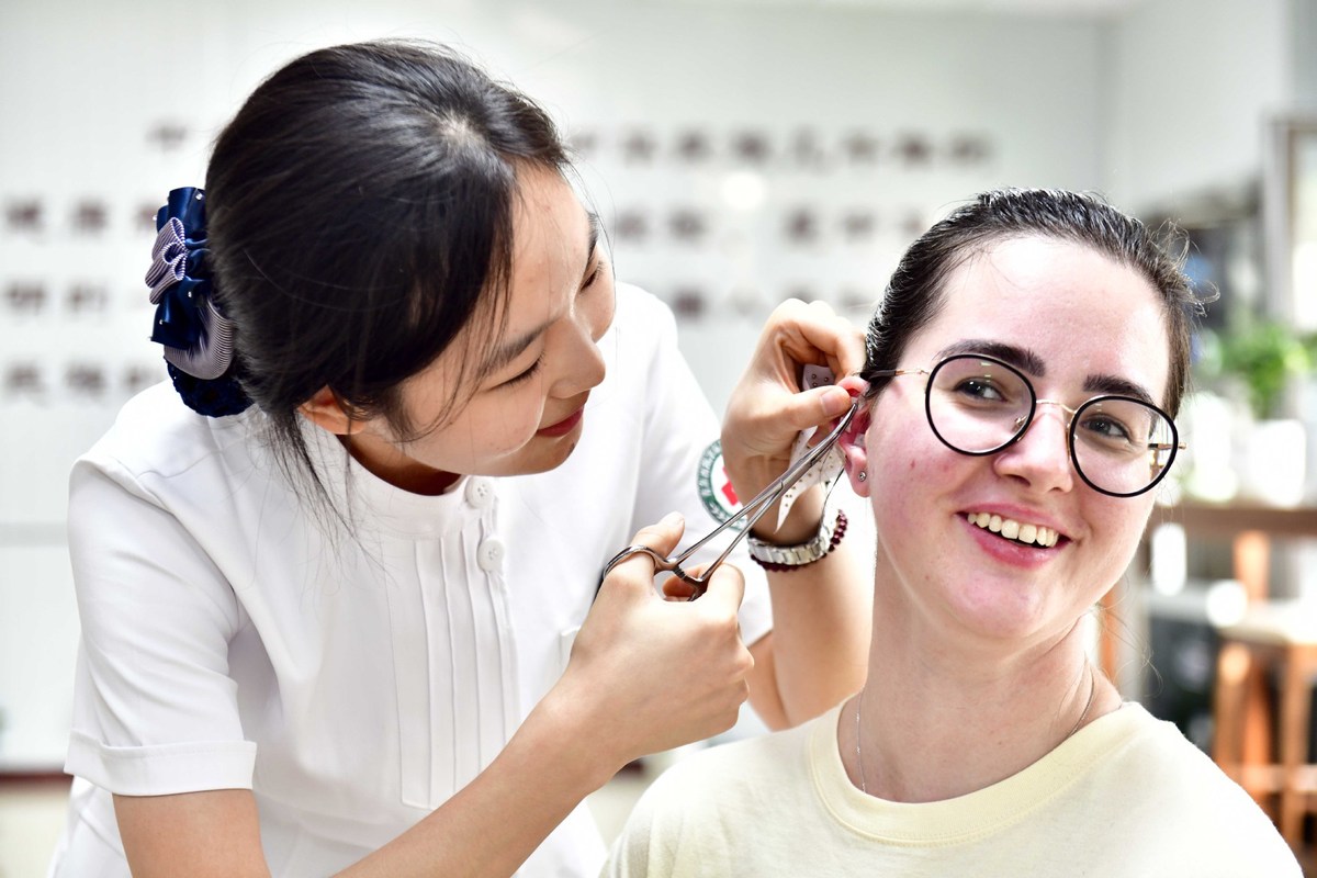 A Slovak student from the College of International Exchange of the Shandong University of Science and Technology experiences a traditional Chinese medicine therapy on ears at a traditional Chinese medicine hospital of the Xihai'an (West Coast) New Area in Qingdao, East China's Shandong province, Oct 18, 2023. The hospital, in cooperation with the College of International Exchange of the Shandong University of Science and Technology, invited international students from Belt and Road Initiative (BRI) partner countries to experience the charm of traditional Chinese medicine culture here on Wednesday. [Photo/Xinhua]