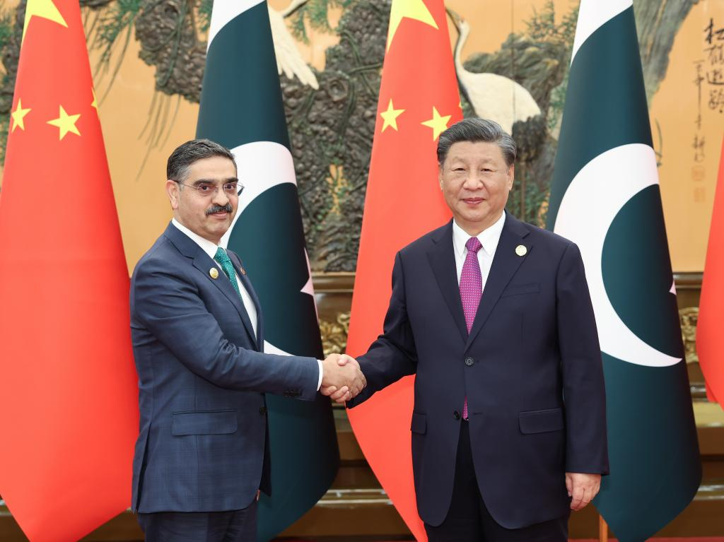 Chinese President Xi Jinping meets with Prime Minister of Pakistan Anwar-ul-Haq Kakar, who is in Beijing for the third Belt and Road Forum for International Cooperation, at the Great Hall of the People in Beijing, capital of China, Oct. 19, 2023. (Xinhua/Yin Bogu)