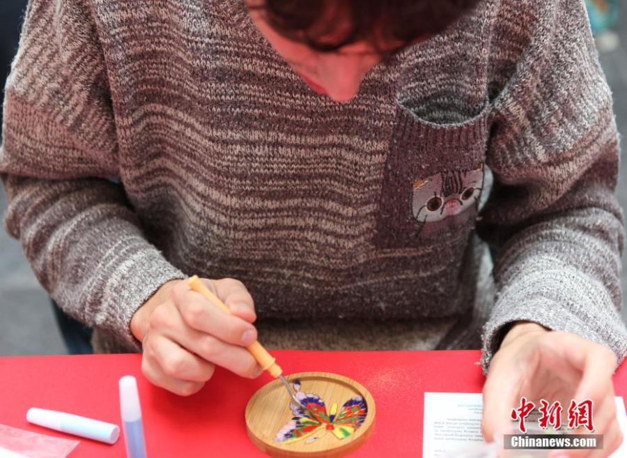 A man tries cloisonne craft during the Confucius Institute Day at the Confucius Institute in Leuven, Belgium, Oct. 19, 2023. (Photo: China News Service/De Yongjian)