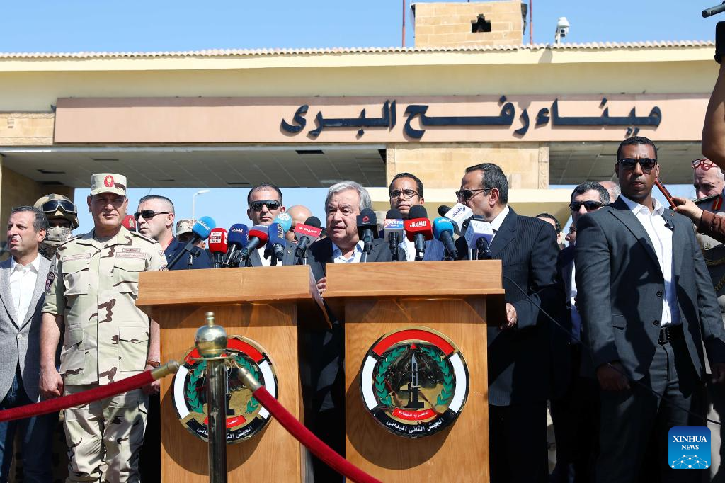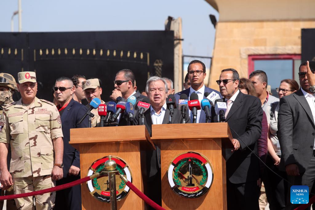UN Secretary-General Antonio Guterres speaks while visiting the Egyptian side of the Rafah border crossing with Gaza, on Oct. 20, 2023. (Xinhua/Ahmed Gomaa)