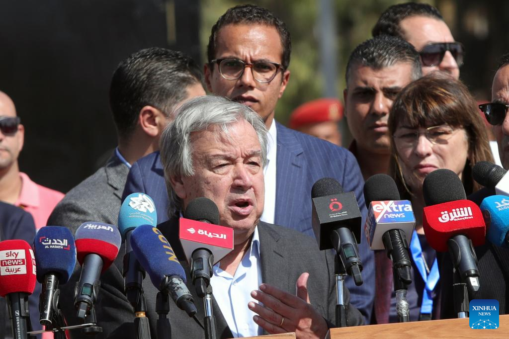RAFAH, Egypt, Oct. 20 (Xinhua) -- UN Secretary-General Antonio Guterres on Friday visited the Egyptian side of the Rafah border crossing with Gaza, ahead of the anticipated opening of the crossing to bring needed aid into the besieged Palestinian enclave.