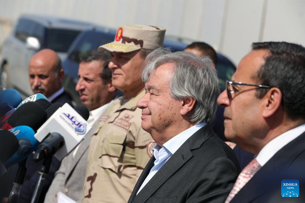 UN Secretary-General Antonio Guterres (C) speaks while visiting the Egyptian side of the Rafah border crossing with Gaza, on Oct. 20, 2023. (Xinhua/Ahmed Gomaa)
