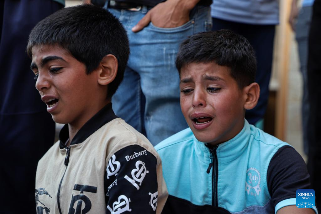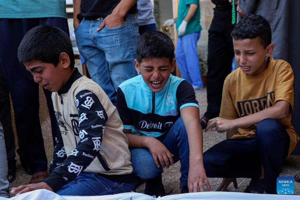 Boys mourn for their relatives at a hospital in the southern Gaza Strip, Oct. 20, 2023. The number of Palestinian fatalities has exceeded 3,785, with over 13,000 individuals sustaining injuries since Oct. 7, said the health ministry in Gaza on Thursday. (Photo by Rizek Abdeljawad/Xinhua)