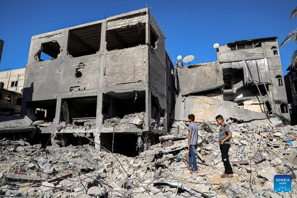People are seen at a building destroyed in Israeli airstrikes in the southern Gaza Strip city of Khan Younis, Oct. 20, 2023. The number of Palestinian fatalities has exceeded 3,785, with over 13,000 individuals sustaining injuries since Oct. 7, said the health ministry in Gaza on Thursday. (Photo by Rizek Abdeljawad/Xinhua)