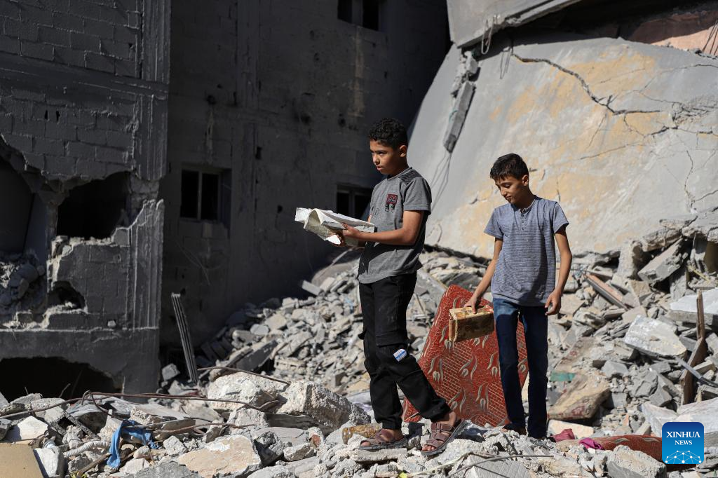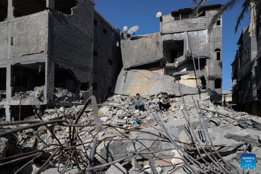 A boy stands on ruins of dwellings destroyed in Israeli airstrikes in the southern Gaza Strip city of Khan Younis, Oct. 20, 2023. The number of Palestinian fatalities has exceeded 3,785, with over 13,000 individuals sustaining injuries since Oct. 7, said the health ministry in Gaza on Thursday. (Photo by Rizek Abdeljawad/Xinhua)
