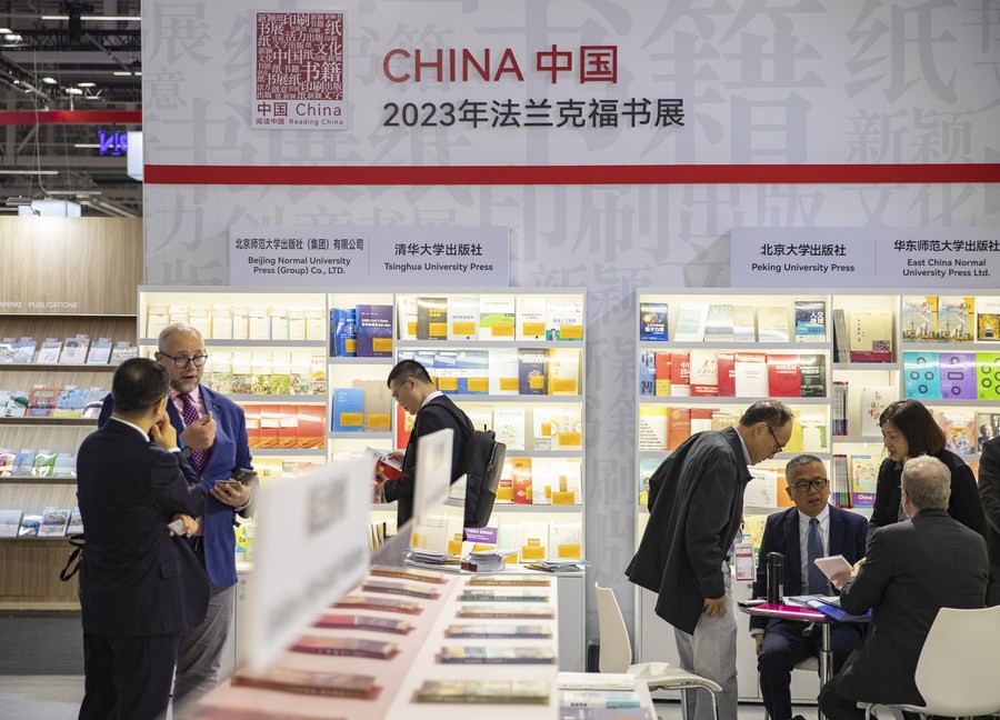 Visitors walk past the Chinese publishers' exhibition area at the 75th Frankfurt Book Fair in Frankfurt, Germany, Oct. 18, 2023. (Xinhua/Zhang Fan)