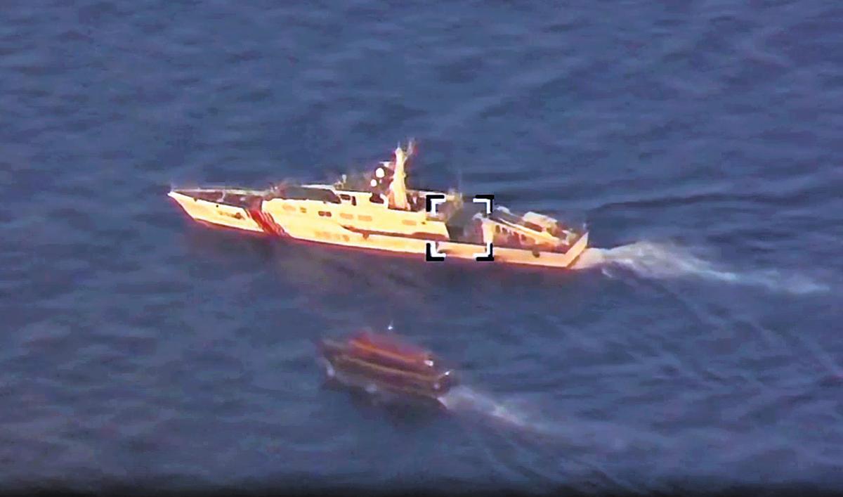 A China Coast Guard ship lawfully intercepts a smaller Philippine vessel near Ren'ai Reef in the South China Sea on Sunday. The Philippine vessel was trying to deliver construction material to an illegally "grounded" military vessel. THE CHINA COAST GUARD