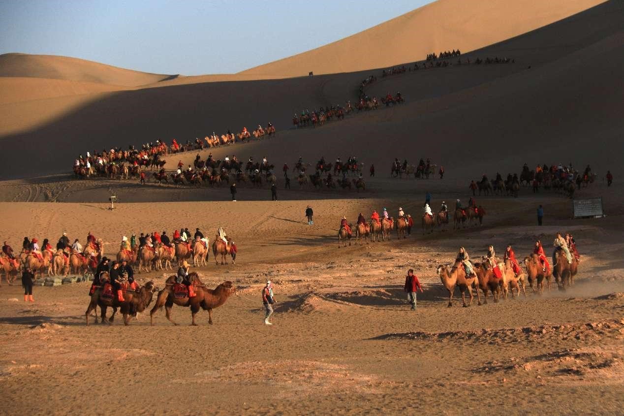 Tourists visit the Yueya Spring scenic area, a crescent-shaped lake surrounded by giant sand dunes, in Dunhuang, northwest China's Gansu province, Oct. 13, 2023. (People's Daily Online/Zhang Xiaoliang)