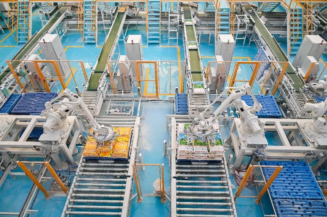 Robots are piling packed wheat flour in a workshop in an industrial park in Changji Hui autonomous prefecture, northwest China's Xinjiang Uygur autonomous region. (People's Daily Online/Tao Weiming)