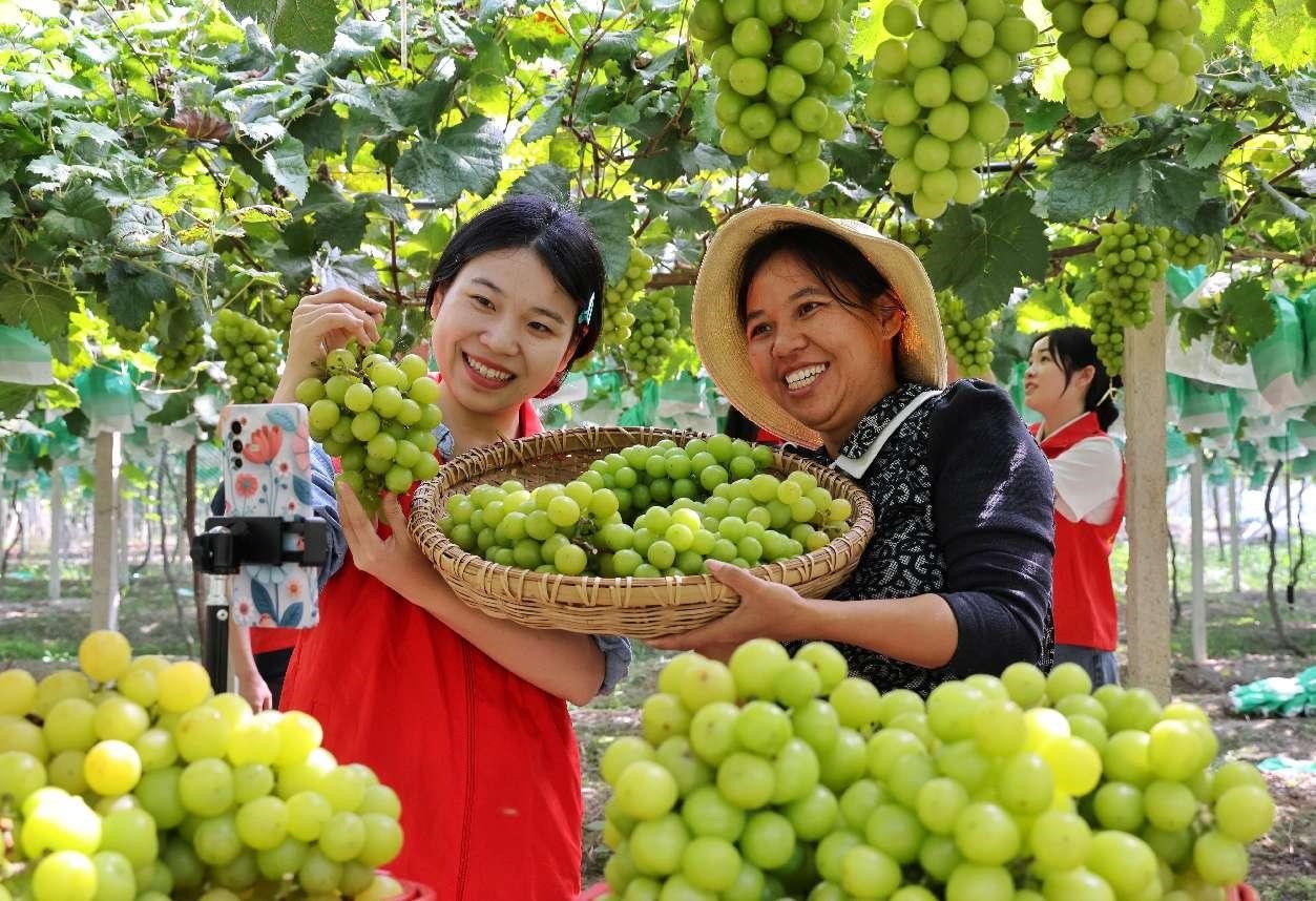 Villagers sell grapes via livestreaming in an ecological orchard in Luxi county, Pingxiang, east China's Jiangxi province. (People's Daily Online/Deng Jianping)