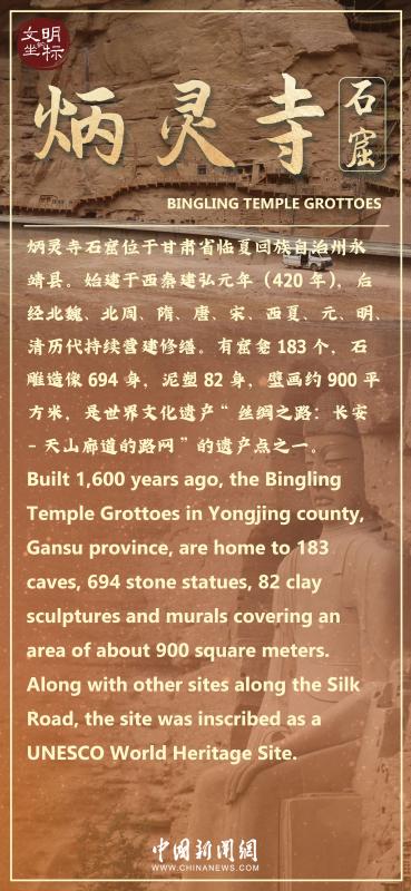 Built 1,600 years ago, the Bingling Temple Grottoes in Yongjing county, Gansu province, are home to 183 caves, 694 stone statues, 82 clay sculptures and murals covering an area of about 900 square meters. Along with other sites along the Silk Road, the site was inscribed as a UNESCO World Heritage Site.
